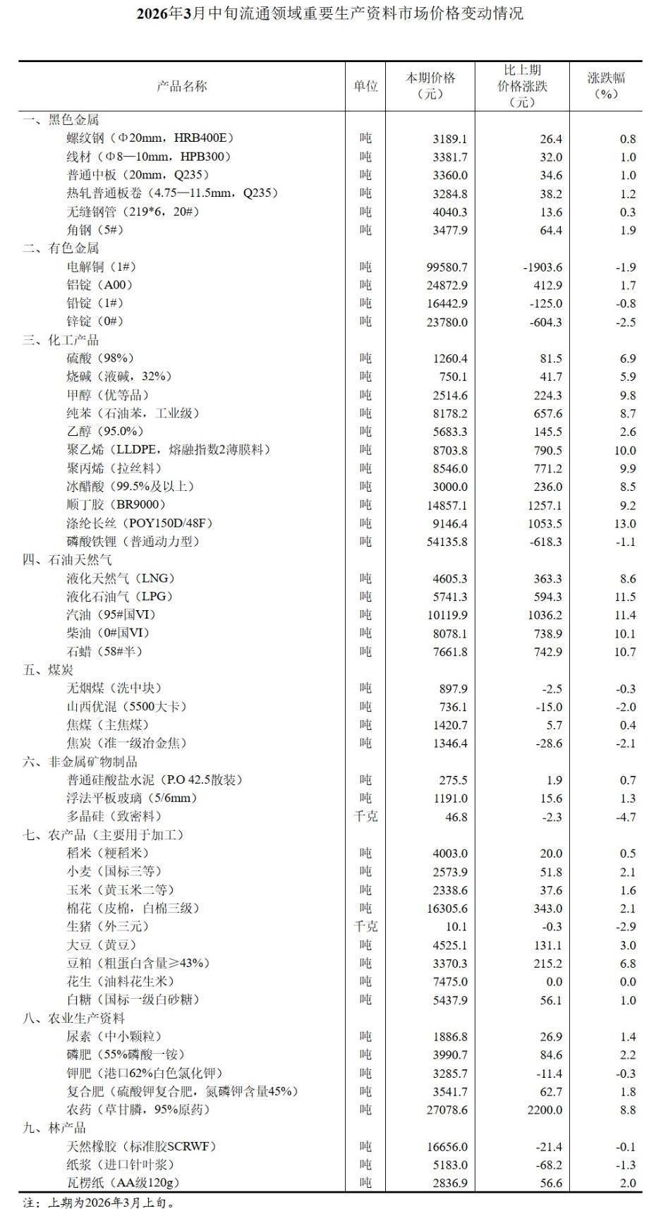3月24日,国家统计局发布2026年3月中旬流通领域重要生产资料市场价格变动情况。据对全国流通领域9大类50种重要生产资料市场价格的监测显示,2026年3月中旬与3月上旬相比,37种产品价格上涨,12种下降,1种持平。