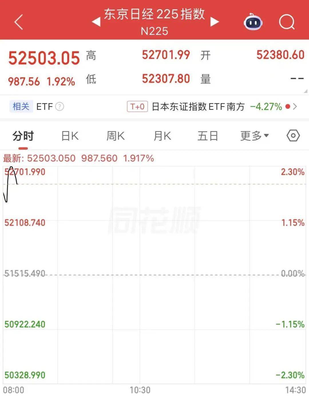 继美股收涨之后,3月24日,日韩股市大幅高开。其中, 日经225指数开盘大涨1000点, 截至发稿,日经225指数涨1.92%,报52503点。金属和芯片相关类股领涨,JX Advanced Metals涨超7%,瑞萨电子涨超6%。 20年期日本国债收益率下降2.5个基点至3.140%;30年期日本国债收益率下降1.0个基点至3.550%。